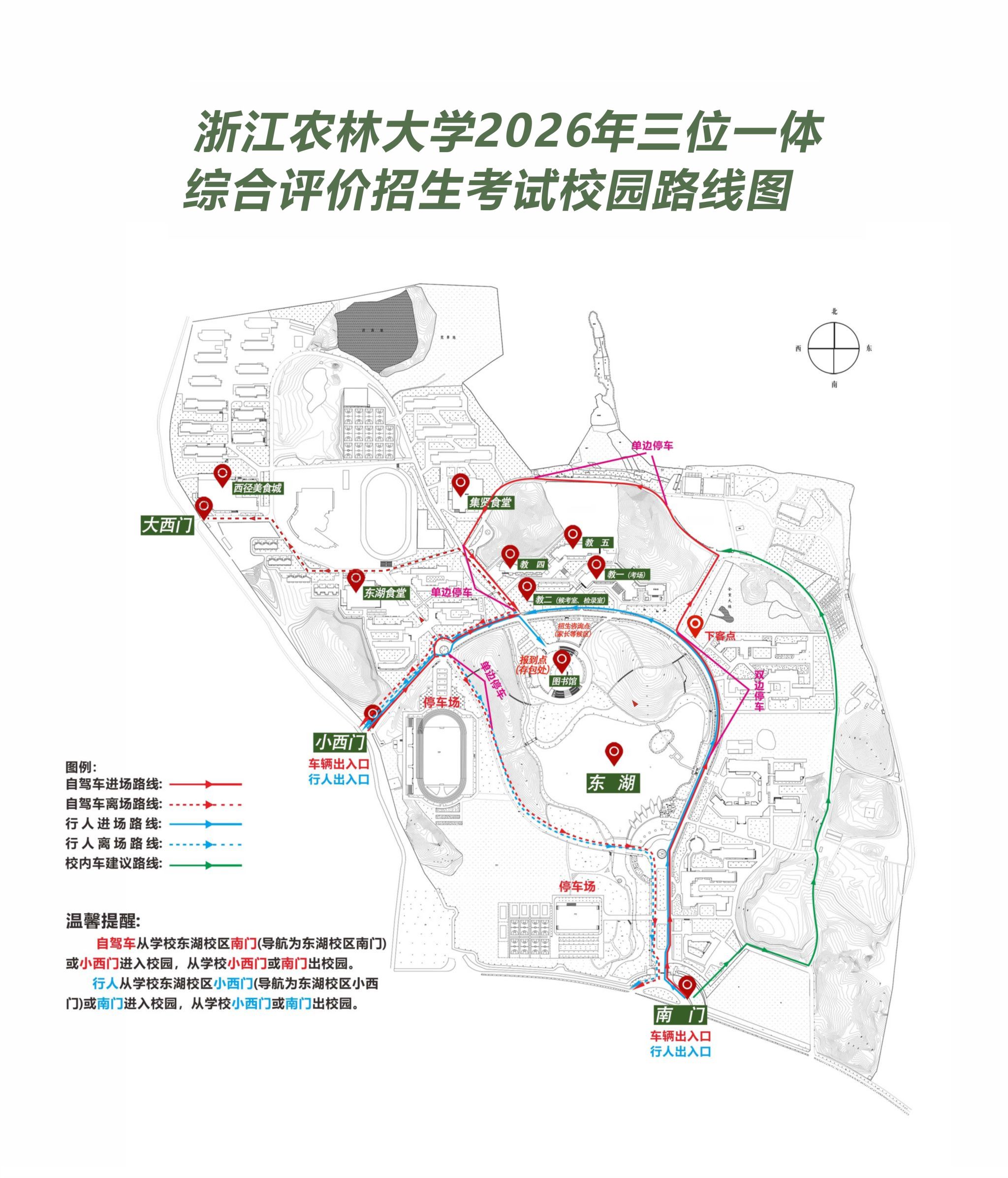 3.自驾车:自驾车前来的考生(陪同人员)请导航至浙江农林大学东湖校区南门。如走高速,可在G56杭徽高速临安出口下高速。自驾进校务必听从学校工作人员指挥,文明有序通行和停车,请在车上挡风玻璃处留下车主手机号码以便及时联系,报到和测试期间无需缴纳停车费。